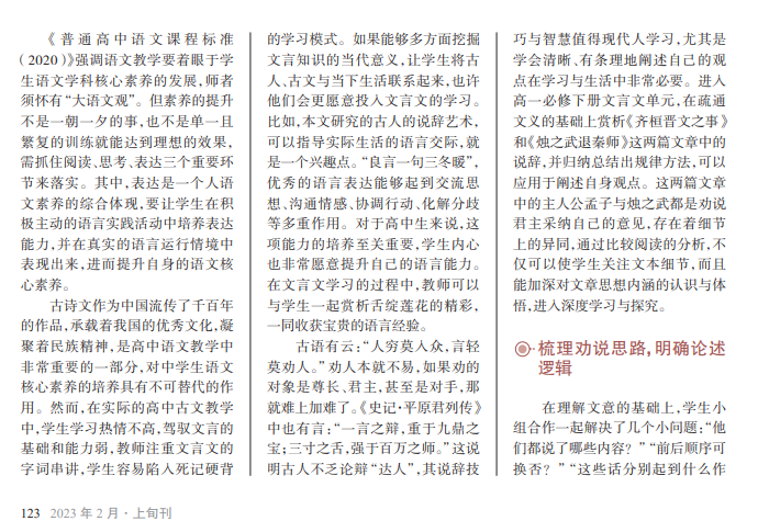 《普通高中语文课程标准 (2020)》希望突破单篇的精讲 细读,突出文本之间的比较,把 语文教育的重心放到学生的自 主学习上。语文教学借助经典 文本的阅读,教会学生比较阅 读,并学以致用。本文在践行群 文比较的阅读方法基础上,以 《齐桓晋文之事》与《烛之武》两 篇文言文为例赏析其中的劝说 游说,引导学生领略古人的说辞 艺术,并迁移至实际应用,即如 何阐述自身观点,采用梳理、总 结、对比、辨析等方法,以落实教 学任务,学会清晰地阐述自己的 观点。