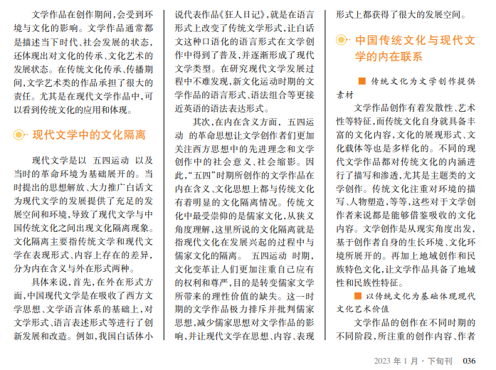文学作为一种艺术表现形式,会随着社会文化的发展而不断发生变化。中国文学在发展演变中承载着民族特色文化,并且随着时代的发展,其内容在不断丰富。传统文化是我国文学艺术的重心,而现代文学则是基于历史发展而推出的新文学,继承了传统文学的精华,也适当摒弃了糟粕。