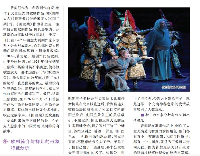 歌剧《图兰朵》作为贾科莫·普契尼创作的最后一部歌剧,不论是对中西方音乐文化的交流,还是对歌剧的发展,都具有历史性的意义。咏叹调《主人,请听我说》作为《图兰朵》中柳儿最具代表性的咏叹调之一,深刻刻画了柳儿的人物形象。