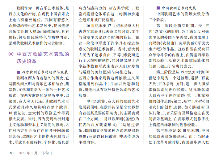 歌剧艺术的产生可以追溯到中世纪时期,随着文艺复兴运动的兴起和新航路的发展,西方音乐在欧洲及世界上产生了深远的影响。歌剧作为一种艺术形式,具有独特的魅力,包含音乐、美学、抒情和民族精神,能够引起人们的共鸣,受到广大群众的喜爱。因此,歌剧艺术不仅是一种文化,而且具有民族精神和时代特征的内涵。中国的歌剧从改革开放以来有了较大起色,确立了发展道路与方向。在西方歌剧传入后,我国对其进行了很多本土化的改动与创新。