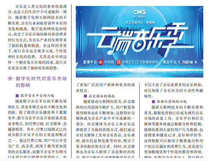 当今世界,流行音乐已经成为大众文化的一部分。作为一种广泛传播的文化形式,流行音乐各种流派和类型层出不穷,影响了全球范围内的年轻人。流行音乐一直在推动着时代的变迁和文化的发展。尤其是在当今数字化和社交化的时代,流行音乐呈现更加普及和多元化的发展趋势,给人们带来了更多的乐趣和思考。