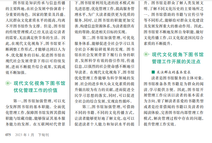 经济全球化的发展趋势使得国家之间的竞争越来越激烈,这种竞争不仅体现在经济上,还体现在文化上。图书馆有助于丰富人的精神世界,提升人的文学素养。在社会不断进步发展的时代背景下,现代文化视角下图书馆的职能和重要性越发凸显。图书馆必须为读者提供个性化服务,体现“以人为中心”的新时代图书馆管理理念。