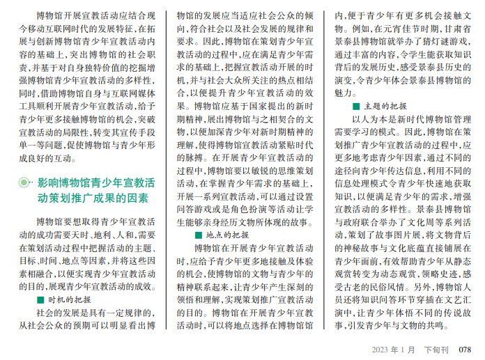 在互联网时代下,博物馆开展青少年宣教活动应紧跟时代的步伐,创新宣教活动的策划与推广方式,在保证博物馆长效发展的基础上,利用信息技术手段开展宣教活动,以便促使宣教活动具有更多的发展机会。