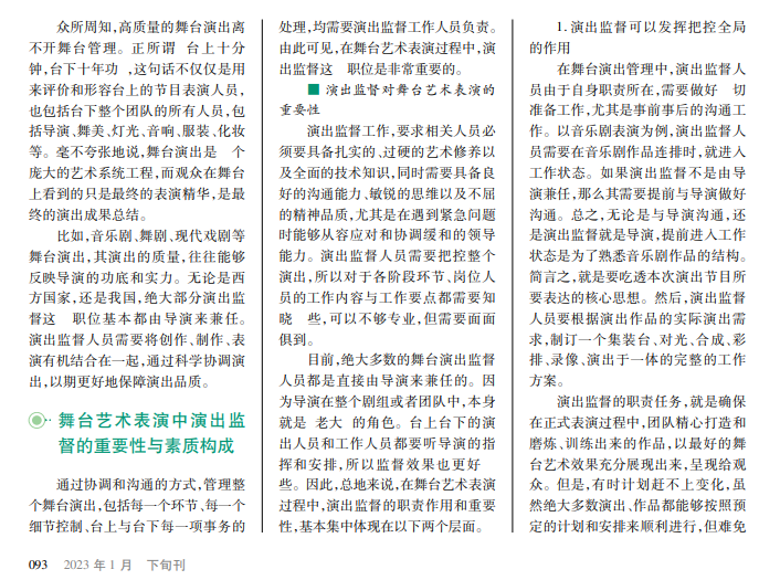 现实中,常见的音乐剧、舞剧或戏曲等舞台艺术表演,对于台下或者荧幕前的观众来说,似乎很轻松、很享受;而对于舞台所有参与者、演出管理人员而言,他们在整个演出过程中必须时刻保持警惕,要做好万全之策和一切紧急突发情况的应急准备,才能最大限度地排除一切潜在问题,确保演出活动可以顺利进行并完美完成。在整个过程中,演出监督的职责角色非常重要,需要负责舞台的协调管理工作,确保演出活动的质量。