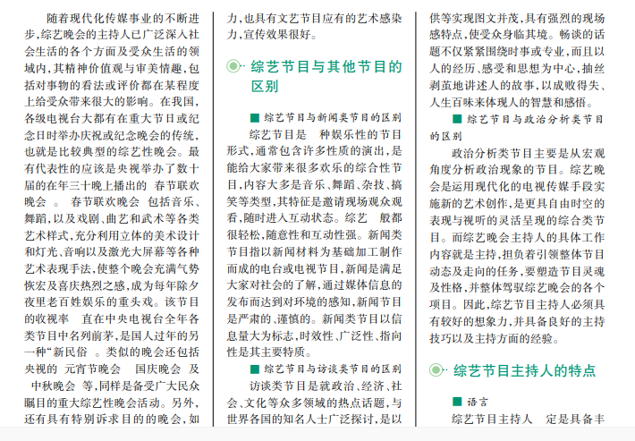 随着现代电视业的发展,综艺节目在收视率上有很大的提升,很多综艺节目主持人被大家所喜爱。随着综艺节目越来越多,竞争力也越来越大,优胜劣汰在综艺节目中尤为突出,这就需要主持人具有极高的综合素质。不同于其他节目,综艺节目更需要的是表演与主持相结合。表演包括很多元素,其中,想象力尤为重要。