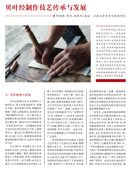 贝叶经制作技艺作为非 物质文化遗产之一,其最主要 的特点是以人为载体的活态 性传承,传承人本身就是非物 质文化遗产的承载者和传递 者。当前,传承和发展非物质 文化遗产的核心问题,就是借 助数字科技技术记录传统工 艺,并结合社会、国家、政策对 传承人进行保护和扶持,同 时,需要利用好贝叶经制作技 艺所蕴含的傣族文化特点,结 合西双版纳旅游经济,打造品 牌效应,走非遗产业化道路。