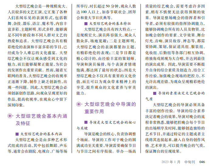 大型综艺晚会是群众喜闻乐见的表演形式,其主题突出、内容丰富,能够吸引观众的注意力,表达美好生活愿景。一场好的大型综艺晚会不仅可以为观众呈现视觉盛宴,而且能够体现导演的创作水平和协调能力。如何让大型综艺晚会别具一格,导演在创作过程中扮演着重要角色。