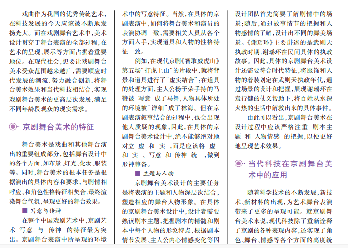 传统的京剧舞台美术与传统戏剧的整体艺术观念和审美视角相同,都力求达到整体表现的统一与和谐。随着科学技术的不断发展,传统艺术与科技的碰撞和融合逐渐成为大势所趋。京剧表演的舞台手段、人物情节等与时代的碰撞最明显。如何将京剧舞台美术与当代科技相结合,给予观众极致的视觉体验和审美感受,成为京剧未来的发展趋势。