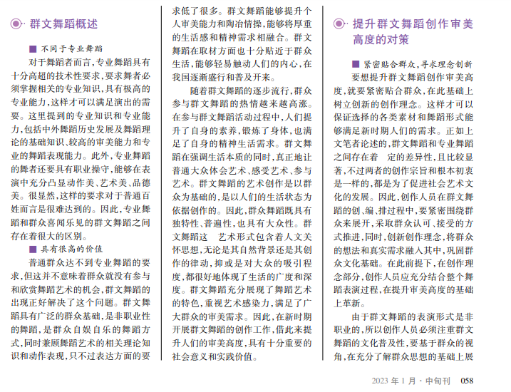 群文舞蹈作为舞蹈艺术领域的重要组成部分,和群众的生活紧密贴合。随着社会的迅速发展和人们精神文明需求的提升,群文舞蹈创作者要提高舞蹈审美层次,创作符合群众审美需求的舞蹈作品。