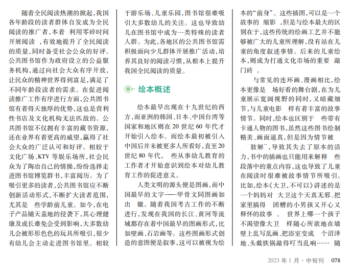 图书馆有着丰富的藏书资源,凭借其得天独厚的优势,引来众多阅读爱好者的驻足。图书馆的读者群体,有阅历丰富的中老年,也有意气风发的青少年,而少儿群体可以称得上是图书馆的“特殊群体”。图书馆中的绘本读物,吸引了更多少儿前来阅读。这有效地提升了少儿的阅读能力,并为培养其良好的阅读习惯打下坚实的基础。为此,各地区图书馆需不断地强化对少儿绘本阅读的推广服务,为少儿的健康成长助力。