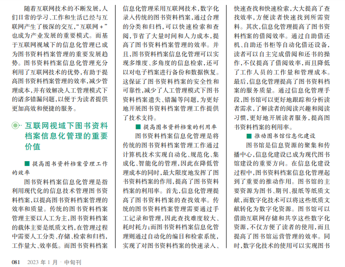 随着数字化时代的到来,互联网技术正在深刻地改变着人们的生活和工作方式。图书资料档案作为重要的知识资源,如何对其进行更好的管理和利用已经成为全社会广泛关注的问题。传统的图书资料档案管理主要是以纸质文献为存储载体,在管理当中存在诸多弊端,如占用大量空间、保管困难、易丢失、利用率低等,需要耗费大量人力物力和财力。而互联网技术的应用可以为图书资料档案信息化管理带来更多的便利和创新,为读者提供更加便捷的服务。