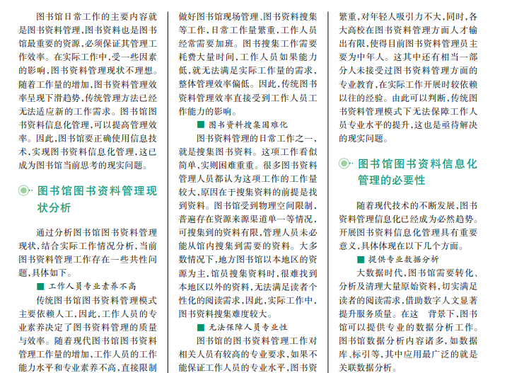 图书馆最重要的资源是图书资料,必须保证图书资料的管理质量与效率。为了高效开展图书资料信息化管理工作,有必要做好研究分析工作。