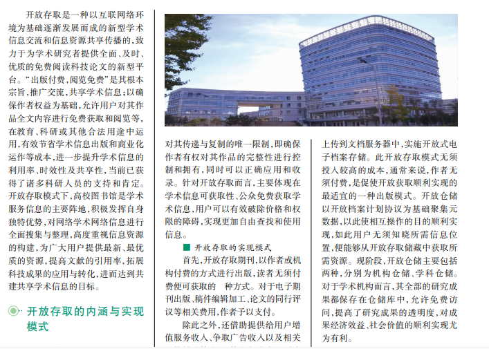 开放存取是一种以互联网络环境为基础逐渐发展而成的新型学术信息交流和信息资源共享传播的,致力于为学术研究者提供全面、及时、优质的免费阅读科技论文的新型平台。“出版付费,阅览免费”是其根本宗旨,推广交流,共享学术信息;以确保作者权益为基础,允许用户对其作品全文内容进行免费获取和阅览等,在教育、科研或其他合法用途中运用,有效节省学术信息出版和商业化运作等成本,进一步提升学术信息的利用率、时效性及共享性,当前已获得了诸多科研人员的支持和肯定。开放存取模式下,高校图书馆是学术服务信息的主要阵地,积极发挥自身独特优势,对网络学术网络信息进行全面搜集与整理,高度重视信息资源的构建,为广大用户提供最新、最优质的资源,提高文献的引用率,拓展科技成果的应用与转化,进而达到共建共享学术信息的目标。
