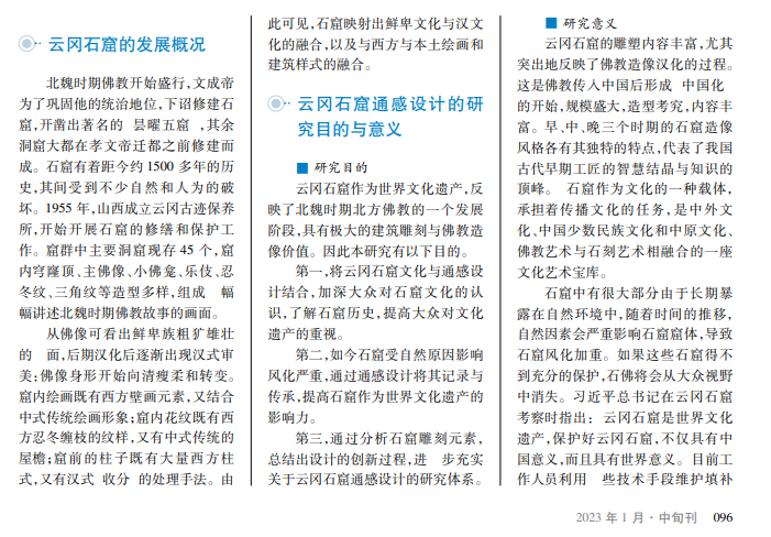 云冈石窟记录着佛教传入中国后的一系列发展,对我国文化传承事业的重要性毋庸置疑。目前来看,与云冈石窟相关的设计很多都是直接把佛像或是窟内雕刻的纹样不加修饰地表达出来,没有做到与现代设计元素有效融合,出现设计表现手法老套现象,现有的关于云冈石窟通感设计也较少。通过通感设计,可以提升大众对艺术作品的欣赏能力,也可以满足大众在视觉层面和听觉层面上的感官需要。