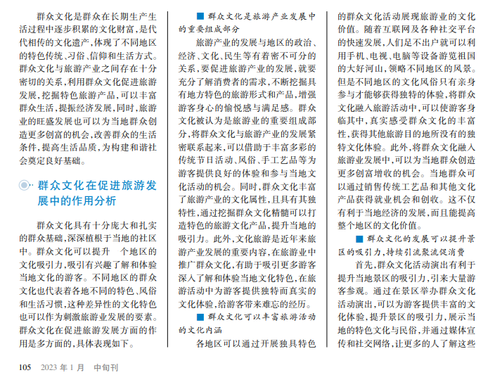 群众文化代表着群众对美好生活的向往,凝聚了基层群众的智慧。群众文化与旅游业存在着十分密切的联系,不仅可以为游客提供了解当地文化的机会,而且可以借助旅游业的发展为当地居民带来经济收益,促进经济发展。因此,应当有意识地促进群众文化与旅游产业的深入融合,突出优势,打造具有地方特色的旅游文化,为旅游业的蓬勃发展提供助力。