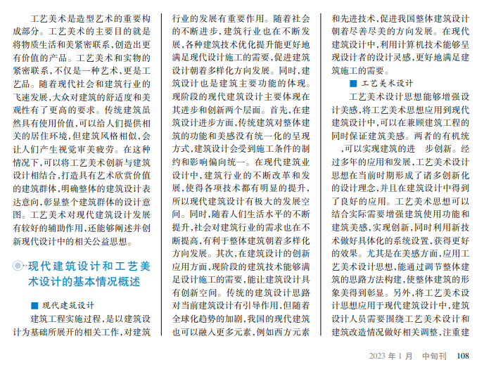 随着现代社会的不断发展,建筑物不仅要满足人们日常的居住需要,而且要彰显艺术价值。建筑美感受到行业的高度关注。在建筑设计中融入工艺美术设计思想,能够让现代整体设计的构想得到发展和突破,在满足建筑基本功能的同时,利用工艺美术创设良好的环境,达到陶冶情操的效果。