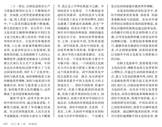 讲好中国故事是向世界展现中国形象、传播中国声音、展示中国力量的重要路径。讲好中国故事,传递中国声音,有助于提升我国的国家形象和我国的综合国力、国际影响力,有助于加强世界对中国的全方面认识,为我国的发展创造良好的国际环境。在复杂的国际话语权竞争中,跨文化讲好中国故事需要重视“讲故事”的叙事策略和技巧的创新。
