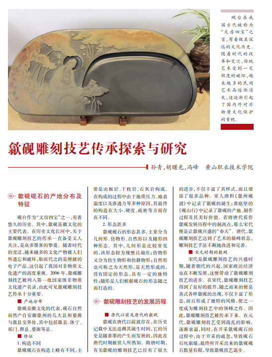 砚 台 在 我 国 古 代 被 称 为 “文房 四宝”之 首,有着极其深 远的文化历史。 随 着 时 代的 改 革和变迁,传统 艺 术 受到 一 定 程度的破坏,越 来越 多 的 民 间 艺 术 品 逐 渐 消 失,这逐渐引起 了 国 内外 对 非 物 质 文 化 保 护 的重视。