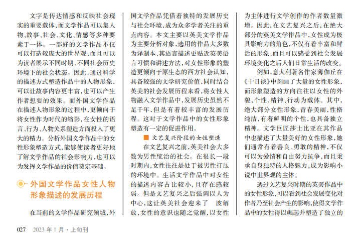 本文站在理论分析与案例解析的角度,阐述了外国文学作品中对女性形象塑造的具体方式,讲述了女性形象塑造的发展历程,尤其是围绕不同的社会发展阶段精准解析,从语言描写的角度分析了女性形象塑造的实际特征。通过单一语言的多角度描述,塑造更加立体化的女性形象,能够提升文学作品的影响力,也可以体现作者本身的观点。