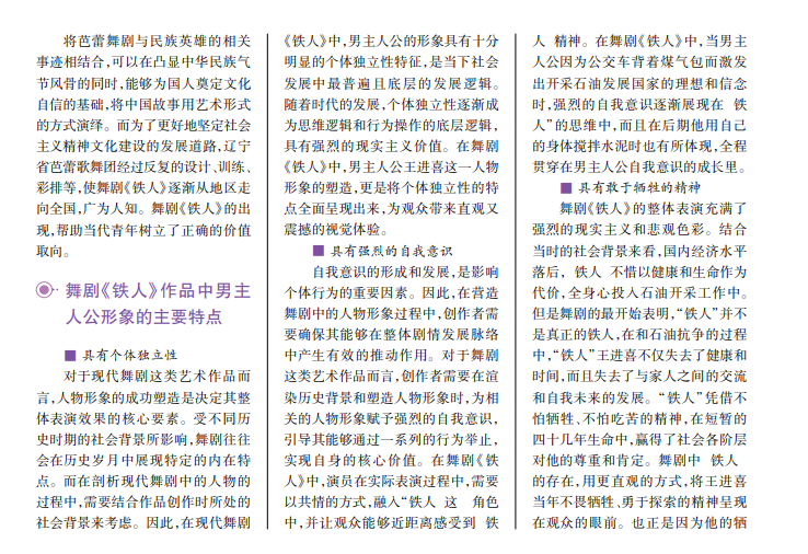 对于艺术作品而言,人物形象的塑造决定着整体表演的成功与否,同时也是赋予其核心灵魂的重要方式。本文通过对舞剧《铁人》中王进喜的形象塑造展开分析和讨论,结合塑造特点与塑造手法,以及舞剧《铁人》本身和当时社会发展的历史背景,对舞剧《铁人》中王进喜这一男主人公的形象塑造有了更深层次的认知,帮助现代青年深刻体会“铁人”精神,以新的视角解读创业年代工人阶级的风貌和家国情怀。
