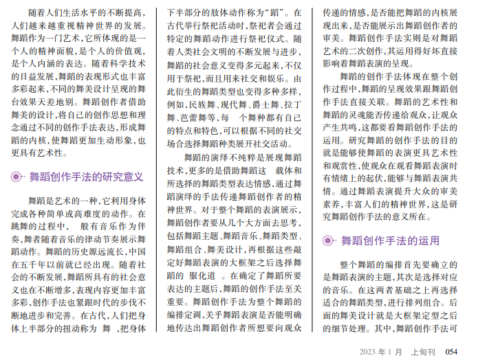舞蹈是身体的语言,通过肢体动作表达情感、传递情绪、引起共鸣。舞蹈的创作需要创作者拥有深厚的文化底蕴,并且对舞蹈的表达手法有深度的掌握,清楚舞蹈想要向观众输出怎样的思想或者想让观众看到什么样的价值观,以引起观众的情感共鸣。舞蹈的精髓在于舞蹈创作,在创作舞蹈时,舞蹈创作手法的运用是不可或缺的一环。