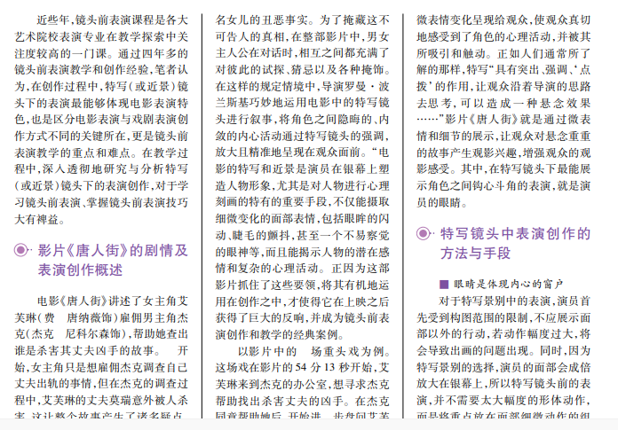 本文通过对影片《唐人街》的分析,论述了在电影特写镜头下,演员运用眼睛和手部如何在荧幕前塑造角色,以及在双人特写镜头下真实交流和组织行动的重要性,阐明了演员在电影特写镜头表演中,需要运用哪些手段来展现人物的心理活动和人物关系,以及特写镜头表演中的要领。