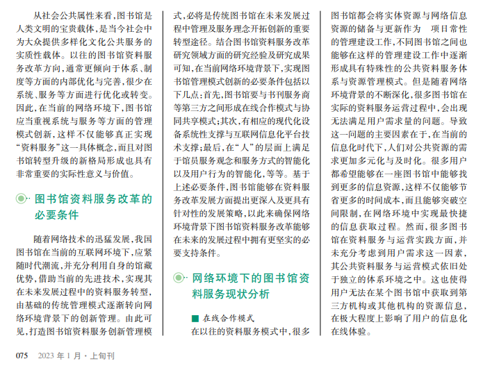 建设进程的逐渐深入,以信息化、数字化为主的新型资料服务模式逐渐影响着当前社会中的更多领域。对于传统图书馆而言,图书馆资料服务改革必将是图书馆在未来发展过程中的新形态。在网络环境下的图书馆资料服务方式及管理创新,也必将成为图书馆在未来创新发展与智能发展中的重要理念与实践结合方向。