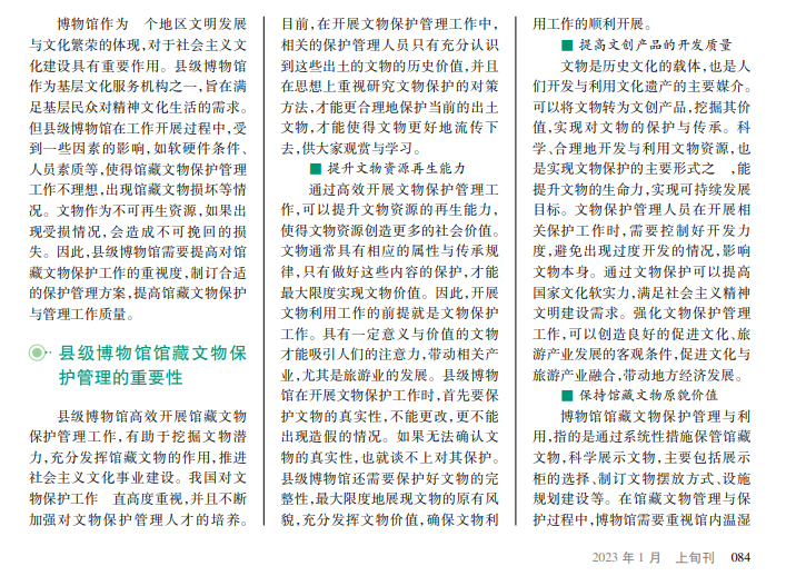 博物馆是文物收藏、保管、科研及展出的专门机构,肩负着传承中华优秀传统文化的使命。县级博物馆作为博物馆的基层组成单位,体现着当地文化事业的发展水平。受一些因素的影响,目前我国县级博物馆馆藏文物保护管理工作并不理想,需要作好研究分析工作,提高其馆藏文物的保护管理工作质量。