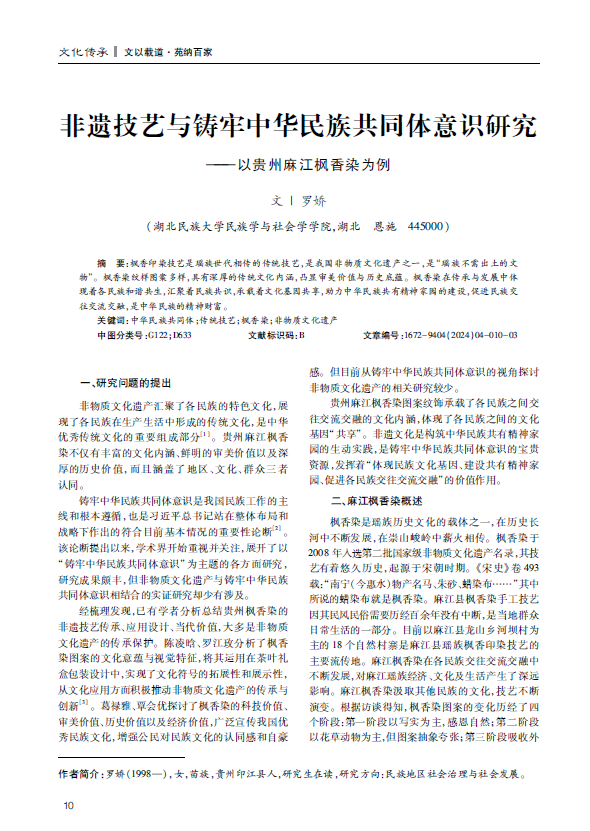 枫香印染技艺是瑶族世代相传的传统技艺,是我国非物质文化遗产之一,是“瑶族不需出土的文物”。枫香染纹样图案多样,具有深厚的传统文化内涵,凸显审美价值与历史底蕴。枫香染在传承与发展中体现着各民族和谐共生,汇聚着民族共识,承载着文化基因共享,助力中华民族共有精神家园的建设,促进民族交往交流交融,是中华民族的精神财富。