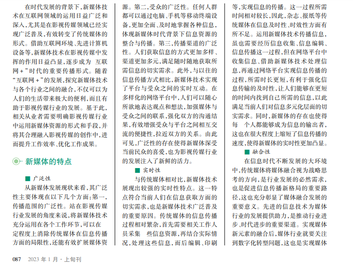 现阶段,随着“互联网 +”与各个行业领域之间的融合日益紧密,新媒体技术在各个行业领域中得到广泛运用,改变了人们以往的生活、工作与学习状态,让人们能够借助各种移动终端,接收到最新的信息与资讯。将新媒体技术与影视传媒行业相结合,不仅可以突出新媒体技术的应用优势,强化影视传媒与新媒体技术之间的内在联系,而且能促进媒体行业可持续发展。