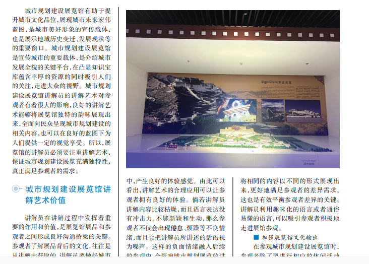 在城市经济文化不断发展的过程中,城市文明建设尤为重要。城市规划建设展览馆是社会和城市文化建设中不可或缺的部分,其中讲解员的作用非常重要,讲解员面对大量的参观者,倘若单纯照本宣科、机械化讲解,将很难让参观者获得个性化的体验,也不能满足他们的实际需求。讲解员应充分把握讲解艺术,以较高的工作素养、运用灵活的语言艺术为参观者带来更好的享受,使其感受城市规划建设所蕴含的文化真谛。