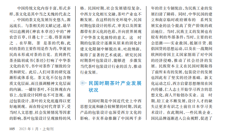 茶文化是中华文化中一颗耀眼的明珠,中华茶文化的发展历史源远流长,博大精深,直到现在仍对中国人有着重要的影响。茶叶包装设计正是受人文思想影响下具有时代特点的茶文化的体现,尤其是民国时期的茶叶包装设计,是我们不可忽视的重要部分,具有特殊的时代基调。