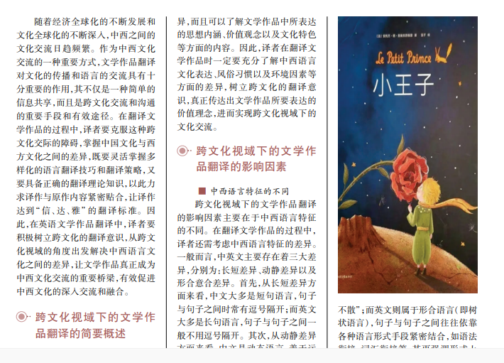 由于中西文化背景不同,英语文学作品翻译不只是两种语言文字的转换,更是文化之间的交流和碰撞。在翻译文学作品时,译者不仅要考虑中西语言特征、风俗习惯、文化特色等方面的不同,而且要灵活掌握多样化的语言翻译技巧和翻译策略,力求译作与原作内容紧密贴合,确保译作的完整度和质量。