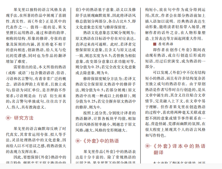 本文研究了果戈里《外套》中的熟语,对比满涛、刘开华、李达的译本,考察翻译中熟语文化意象及修辞的保留情况。分析后发现,文化意象及修辞保留越完整,熟语的幽默效果越佳,语言特色越鲜明。