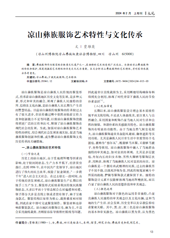 彝族服饰作为国家级非物质文化遗产之一,其独特的艺术性受到广泛关注。为推动凉山彝族服饰的传承和保护,深度挖掘其艺术特性和历史文化尤为重要。本文分析凉山彝族服饰的艺术特性,并对其传承提出参考意见。