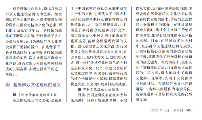 乡村振兴战略实施以来,基层群众文化的建设呈现较好的发展趋势。但是,现阶段的基层群众文化建设面临的困境也是有目共睹的。一方面,城镇化速度加快,使得乡村基层文化出现没落等现象;另一方面,基层群众文化的建设存在政府重视力度不足、欠缺人才、主体地位缺失等问题。