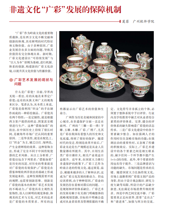 “广彩”作为岭南文化的重要物 质载体,是东西方文化不断交融和 创新的体现,具有鲜明的时代特征 和文物价值。由于多种原因,广彩 业发展存在多方面的问题,导致其 价值没有完全体现出来。新时期, 广彩文化建设以“可持续发展”与 “以人为本”原则为基础,进行机制、 体系的创新,构建新的广彩文化语 境,以提升其文化价值与传播价值。