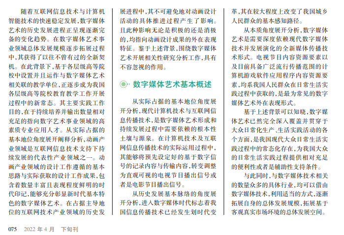 基于互联网信息科学技术的快速持续发展背景,动画设计行业领域的总体发展 范 围 正 在 拓展,逐步从电视媒体时代演变到网络媒体时代,且动画设计行业领域的总体发展进程与数字媒体艺术施加的影响密切相关。