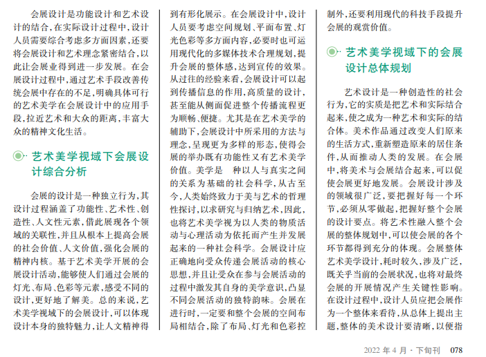 会展设计是功能设计和艺术设计的结合,在实际设计过程中,设计人员需要综合考虑多方面因素,还要将会展设计和艺术理念紧密结合,以此让会展业得到进一步发展。在会展设计过程中,通过艺术手段改善传统会展中存在的不足,明确具体可行的艺术美学在会展设计中的应用手段,拉近艺术和大众的距离,丰富大众的精神文化生活。
