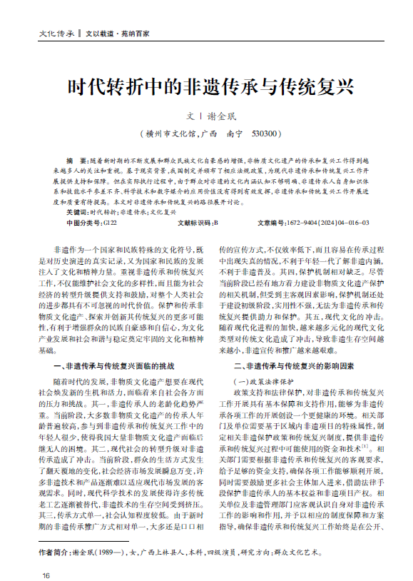 随着新时期的不断发展和群众民族文化自豪感的增强,非物质文化遗产的传承和复兴工作得到越来越多人的关注和重视。基于现实背景,我国制定并颁布了相应法规政策,为现代非遗传承和传统复兴工作开展提供支持和保障。但在实际执行过程中,由于群众对非遗的文化内涵认知不够明确、非遗传承人自身知识体系和技能水平参差不齐、科学技术和数字媒介的应用价值没有得到有效发挥,非遗传承和传统复兴工作开展进度和质量有待提高。本文对非遗传承和传统复兴的路径展开讨论。