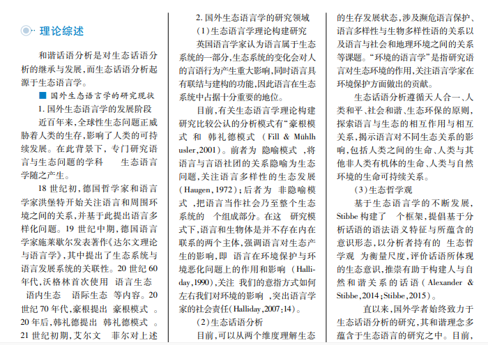 和谐话语分析从生态话语观出发,根植于中国传统文化智慧和中国传统哲学思想,着眼于话语的建构,是在中国特定语境下进行系统生态语言学研究的新路径。其核心思想是以人为本的良知原则、亲近原则和制约原则。这三个原则在“和谐”价值观和“天人合一”哲学观的指导下,以话语语境为背景,与话语中各语言特征相互动,推进人际和人与自然等的和谐。