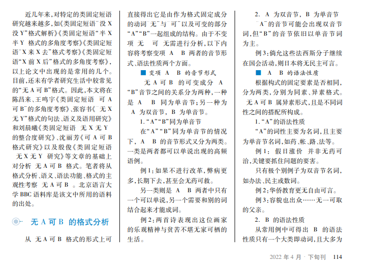 近几年来,对特定的类固定短语研究越来越多,如《类固定短语“没X没Y”格式解析》《类固定短语“半X半Y”格式的多角度考察》《类固定短语“X来X去”格式考察》《类固定短语“X前X后”格式的多角度考察》,以上论文中出现的是常用的几个。目前,还未有学者研究生活中较常见的“无A可B”格式。