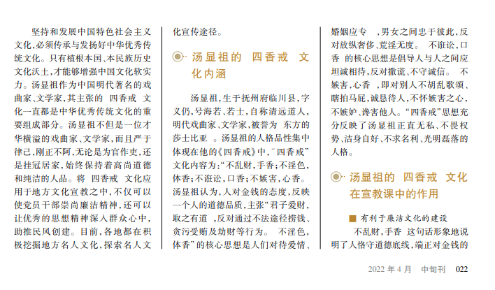在大力弘扬中华优秀传统文化的时代背景下,借助地方名人纪念馆面向广大群众开展文化宣教工作,是传承名人精神、发扬优秀文化的根本举措。汤显祖作为中国明代戏曲家、文学家,其一生缔造了许多优秀思想,这些优秀思想集中体现在他的《四香戒》中。将“四香戒”文化应用于地方文化宣教中,有利于廉洁文化建设、清纯家风与民风形成、社会主义核心价值观的传播,帮助广大群众树立起良好的四香观念。