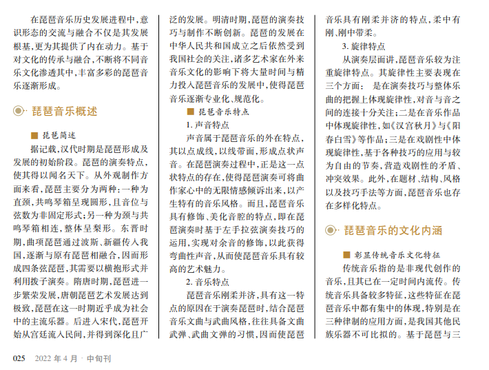 琵琶音乐由于具备宽广的气度,在器乐文化载体中产生了特有的表现风格。其既带有深厚的文化烙印,也包含浓重的文化意蕴,历经千百年来优秀文化的传承与融合,成为当下喜闻乐见的优良传统音乐文化代表,并逐渐发展为世界音乐。