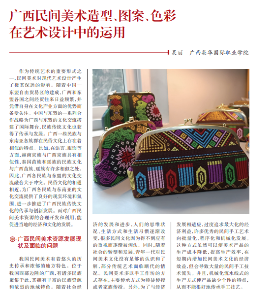 作为民族文化的重要组成部分,广西民间美术凭借造型、图案、色彩等优势,成为 我国传统美术的突出代表之一。广西民间美术文化底蕴深厚、文化特色鲜明,备受人 们的关注。广西民间美术具有多样化的美术形式、极强的感染力和实用性等,不仅凝 聚了历史文化发展,而且是人民群众情感和审美的体现。探索和研究广西民间美术, 不仅能更好地发展和传承传统文化,还能为设计师带来更多的灵感,提升现代美术设 计和美术作品的感染力和活力。