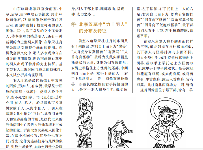 山东临沂北寨汉墓中有数量可观的羽人图像,其中,力士型羽人图像与常见的汉代羽人形象截然不同。“力士羽人”的出现可能与当时外来文化传入中国有关,作为进入汉代墓葬后的一个装饰性元素,表现了外来文化造像艺术初入中国时所做的新尝试。