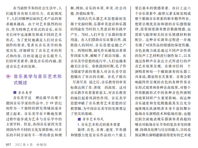 音乐是人类社会中常见的艺术形式,其能够将人们的思想感情与现实生活结合在一起,配合特定的旋律,引发情感共鸣,带来精神享受。音乐美学研究的是音乐的实质与存在原理,与艺术、音乐文化思想、艺术历史都有着紧密的联系,是研究音乐艺术的学科。