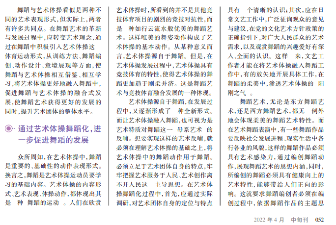 舞蹈是舞蹈艺术与舞台艺术的融合,艺术体操是体现艺术美的体育项目。从艺术的视角来看,舞蹈与艺术体操都体现很强的艺术审美性,两者之间具有较多的共性,也具有相互融合的基础。
