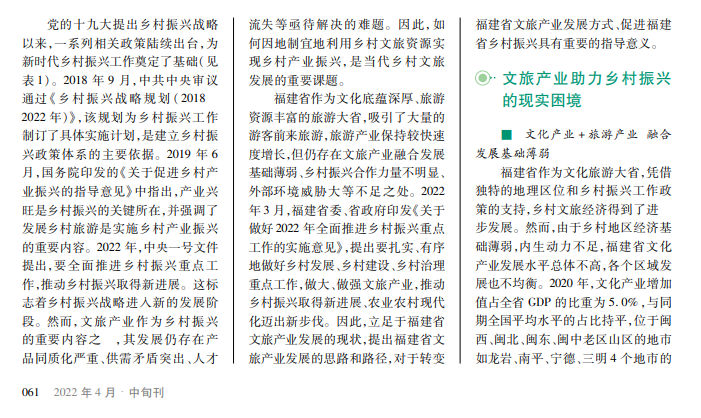 党的十九大提出了实施乡村振兴战略,是实现农业农村现代化建设的战略引领。其中,产业振兴贯穿于乡村振兴的方方面面,是乡村振兴的“ 根”与“魂”。近几年来,在政府政策的支持下,文旅产业蓬勃发展,但传统单一的发展模式存在明显的松散化和低效率的局限性。