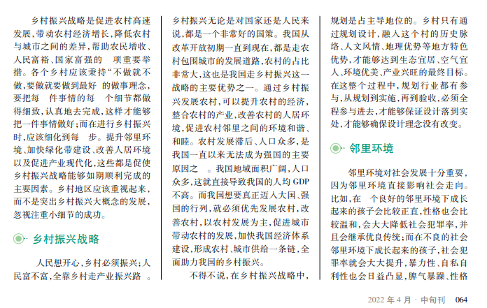 乡村振兴战略在全国各地执行得如火如荼,不仅推动了我国的城市化进程,而且为我国的经济增长做了巨大的贡献。但是,在全国各地争先恐后地发展乡村振兴进程中,还有不少细节问题没有得到真正意义上的解决,比如,邻里环境的改善、绿化建设、空间构造以及人居环境等,都还有很大的提升空间。